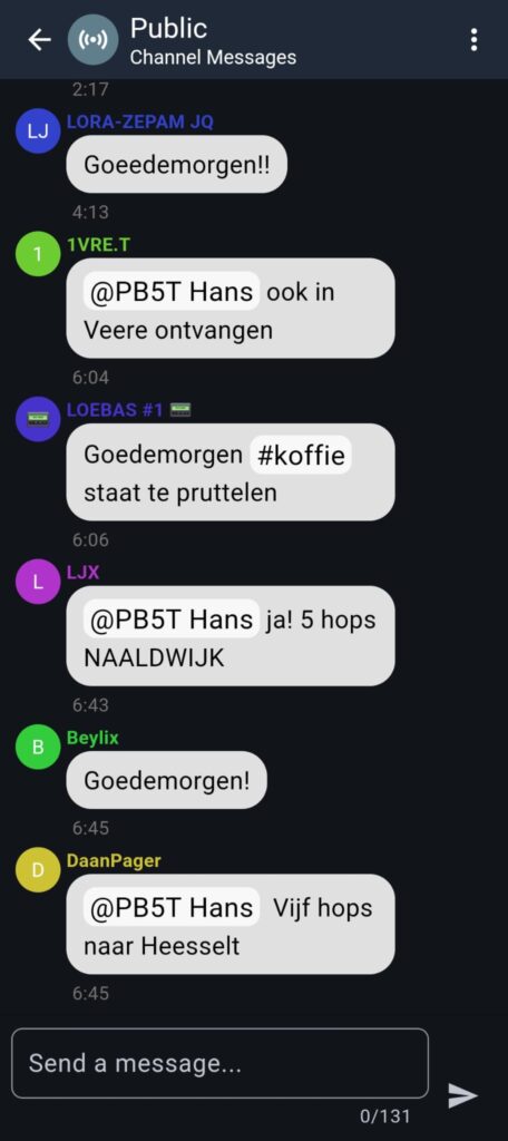 Bijvoorbeeld, als jij en je vrienden een Meshtastic- of meshcore-apparaat hebben, kunnen jullie berichten sturen naar elkaar, zelfs als er geen mobiel netwerk is of als je in een afgelegen gebied bent zonder internet. Dit is vooral handig voor outdoor activiteiten, zoals wandelen, kamperen, of tijdens noodsituaties. Het gebruik van radiofrequenties maakt het ook energiezuinig, zodat de batterijen langer meegaan.