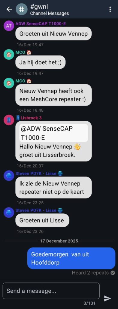 Waar het voor wordt gebruikt: Het wordt vaak gebruikt in slimme huizen, waar apparaten zoals slimme lampen, thermostaten of sensoren met elkaar communiceren via Meshcore. Daarnaast ontstaat er in Nederland zo ook steeds meer een Chatnetwerk, waarbij mensen elkaar berichten kunnen sturen. Dit kan op openbare netwerken, maar ook kun je privé berichten aan bepaalde personen sturen. .